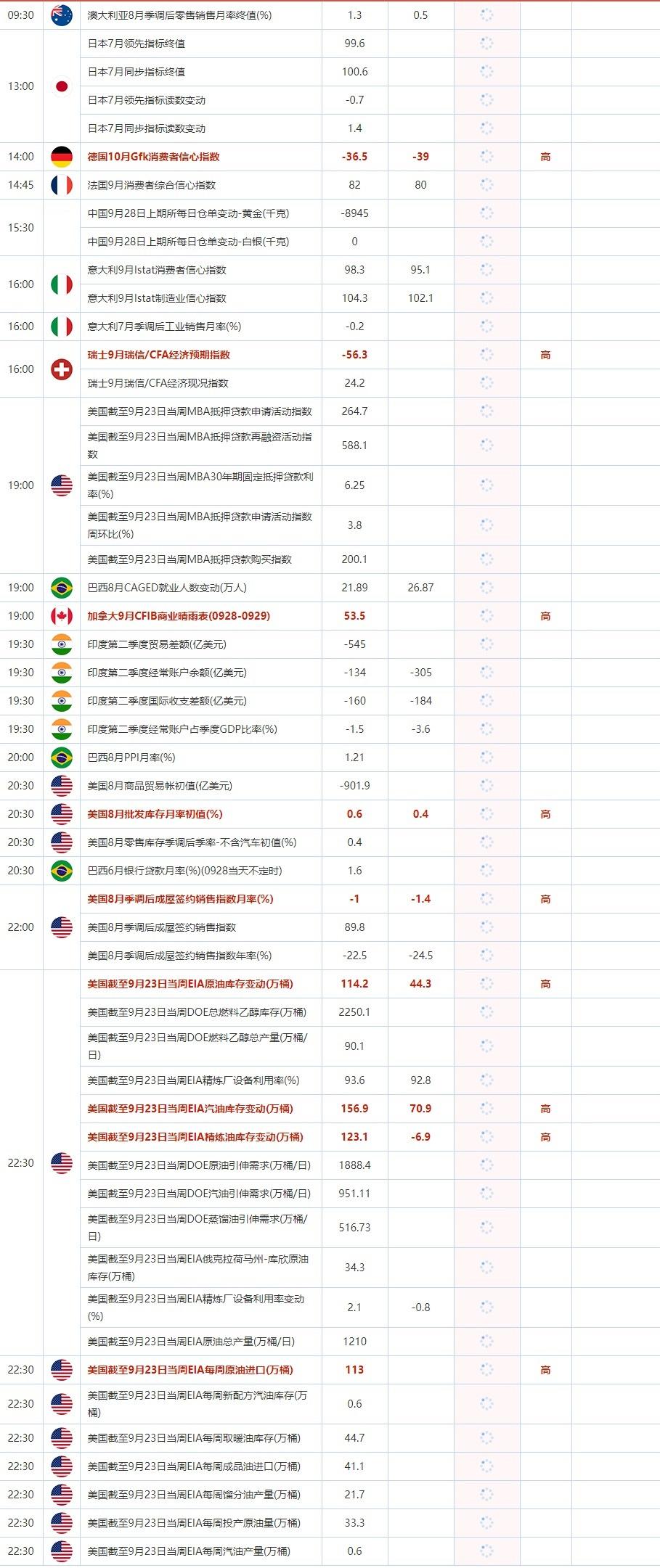 2022年9月28日,全球主要经济体将公布经济数据,需重点关注德国10月Gfk消费者信心指数,加拿大9月CFIB商业晴雨表,美国8月批发库存月率初值,美国8月季调后成屋签约销售指数月率,美国截至9月23日当周EIA原油库存变动。 大事方面需关注:旧金山联储主席戴利发表讲话,欧洲央行行长拉加德发表讲话。