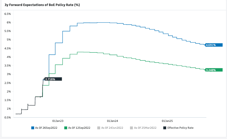 英国央行的任务是将通货膨胀率维持在2.0%,并将在未来几个月提高利率,以减缓经济增长,直到物价上涨放缓。鉴于通胀预期不断上升,市场目前预计在2022年剩余时间加息200个基点,相当于在11月和12月分别加息100个基点。