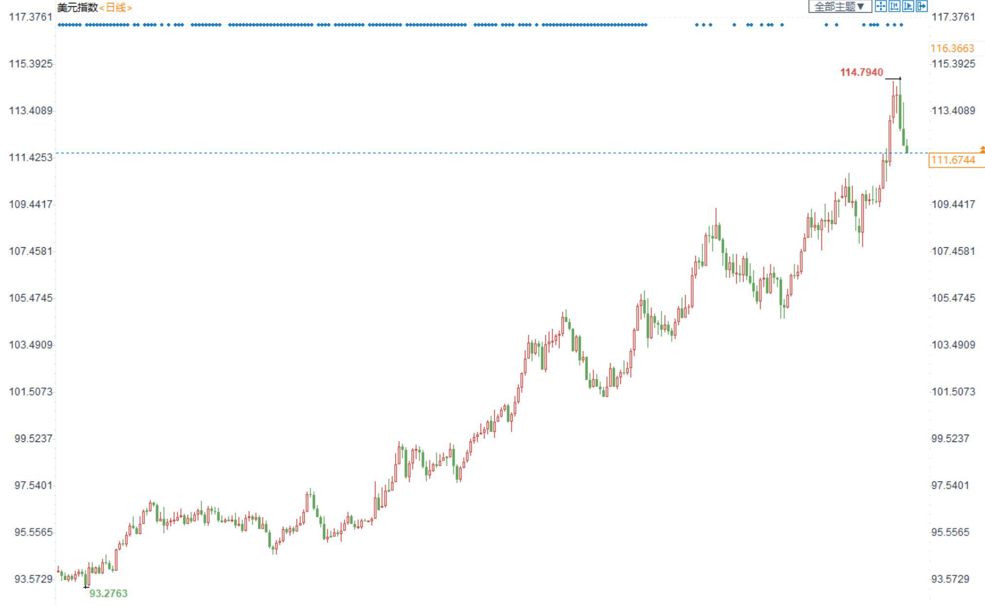 美元指数冲高回落,英日央行的救市行为缓和了市场压力,同时市场继续消化美联储升息前景,全球经济放缓的担忧持续支持避险美元