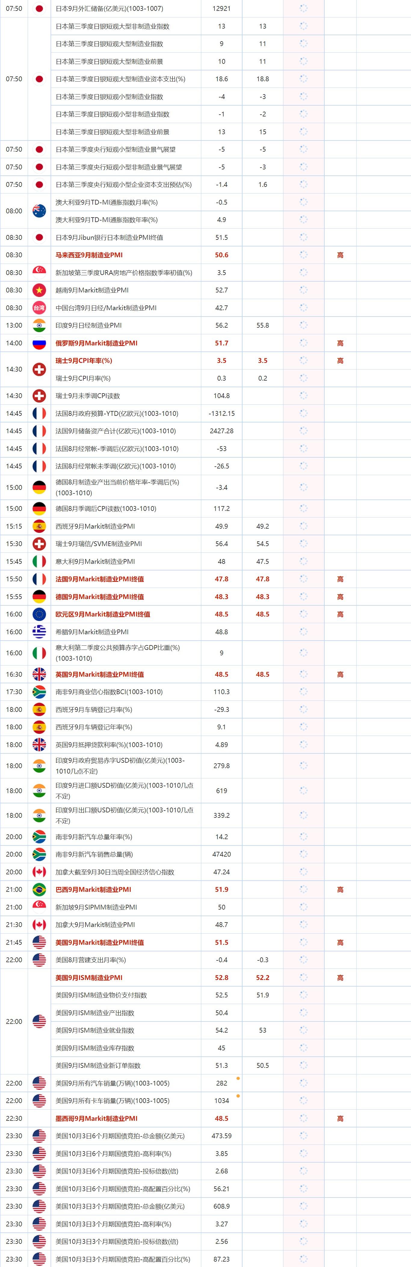 2022年10月3日,全球主要经济体将公布经济数据,需重点德国、法国、英国、欧元区和美国9月Markit制造业PMI终值,瑞士9月CPI年率,美国9月ISM制造业PMI。大事方面需关注欧元区各国外长就欧元区经济召开的会议,英国财政大臣夸滕在保守党年度会议上发表讲话,里奇蒙德联储主席巴尔金发表讲话。此外还需关注中国各大交易所的休市公告。