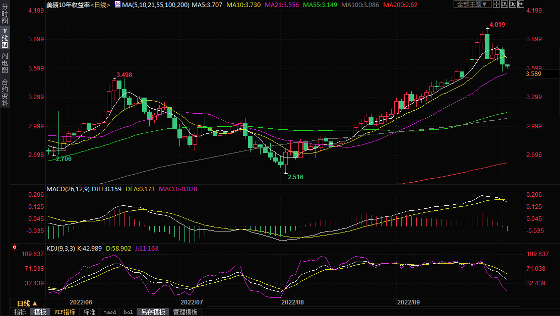 美国10年期国债收益率下降13.4个基点,至3.670%。该收益率上周曾触及14年高点4.109%,然后在英国央行干预后暴跌。美国30年期国债收益率下跌4.3个基点至3.721%。常与利率预期同步变动的两年期美债收益率报4.120%,下降了8.9个基点。