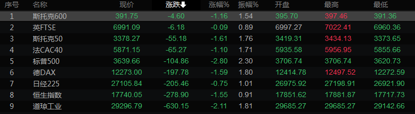 美股收盘情况:道琼斯工业指数收跌2.11%,报29296.79点;标普500指数下跌2.80%,报3639.66点;纳斯达克指数下跌3.8%,报10652.41点。