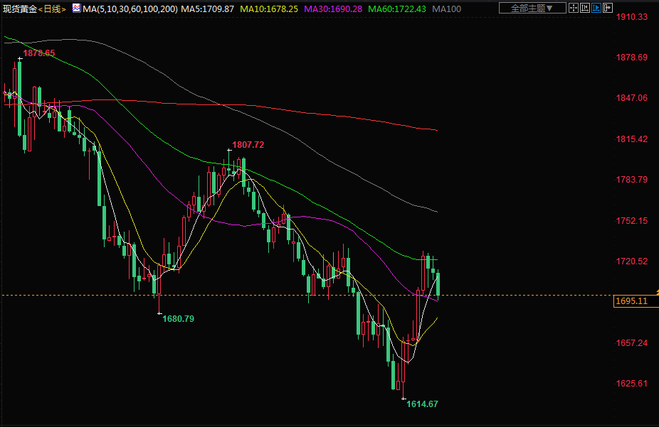 金价上周五下跌,此前好于预期的美国就业报告巩固了美联储将实施大幅加息的预期。Heraeus Precious Metals驻纽约的高级交易员Tai Wong说:“市场认为,强于预期的非农就业报告进一步推动了美联储在11月初的会议上再次加息75个基点。如果金价不能守住1690美元的支撑位,可能会重新测试1660美元水平。市场现在将关注本周的关键通胀数据,以及美联储会议记录。”