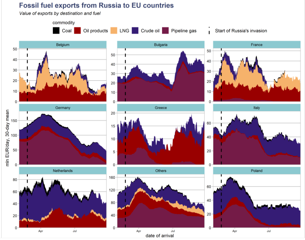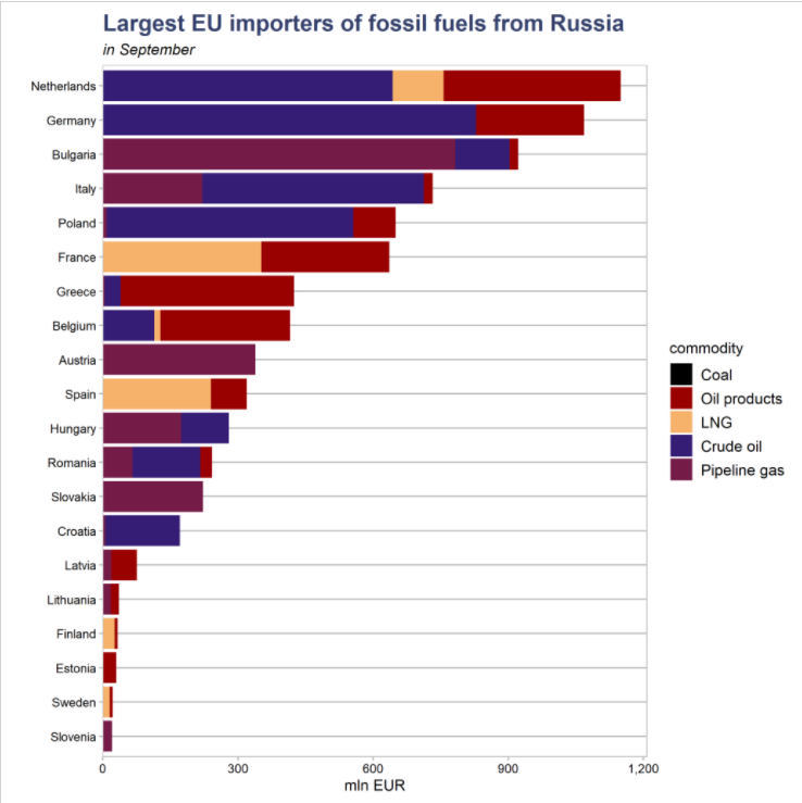 根据能源与清洁空气研究中心(CREA)的统计,从今年2月俄罗斯在乌克兰境内的特别军事行动展开直至9月底,欧盟国家已从俄罗斯进口了价值逾1000亿欧元的煤炭、石油和天然气。
