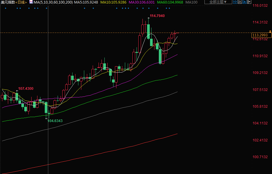 在下午的交易中,美元指数上涨0.2%,至113.25,离上月末触及的20年高点114.78不远。