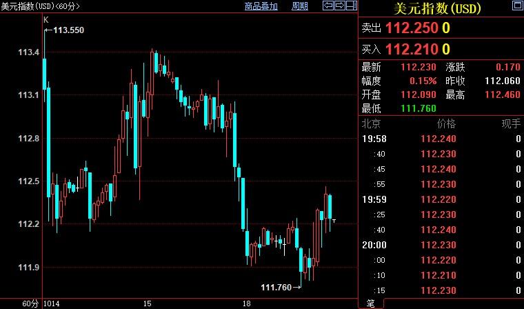 北京时间19:59,现货黄金上浮0.17%至1652.78美元/盎司;美元指数上浮0.13%至112.245。