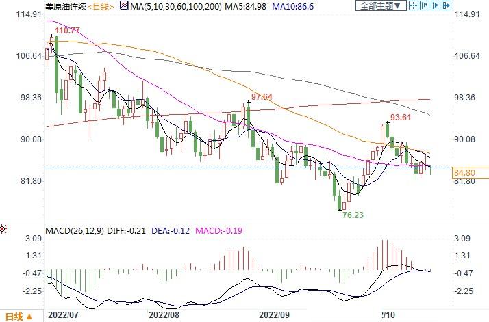 本周美原油下跌约0.78%,相比上周下跌8.08%,跌幅有所收窄。布油亦下跌0.69%左右,而上周下跌7.10%。市场预期亚洲地区疫情管控措施将逐步放松,一改上周对经济衰退的悲观情绪,乐观情绪重燃,这支撑了国际油价。投资者重新评估全球央行大幅加息对能源消费的影响。截止北京时间10月21日19:43,美原油报84.80美元/桶。