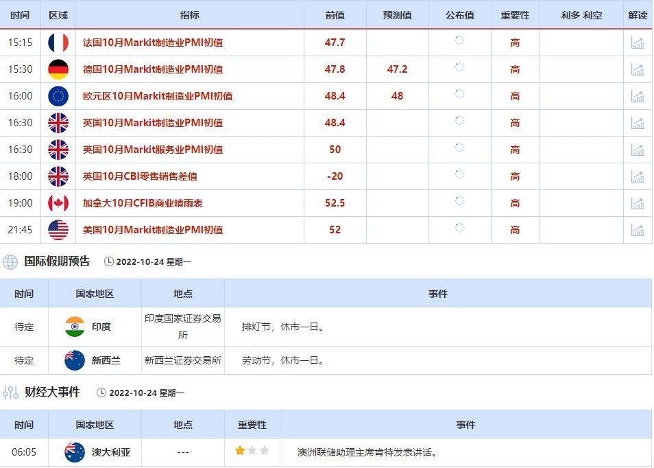 10月24日将发布欧元区和美国10月Markit制造业PMI初值,料继续处于相对位。