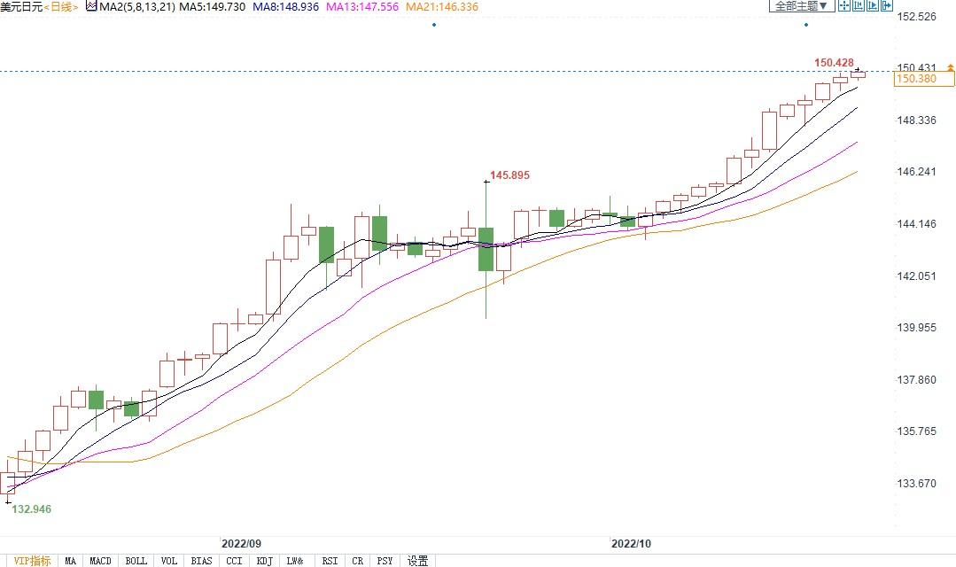 北京时间10月21日13:33,美元兑日元报150.382/391