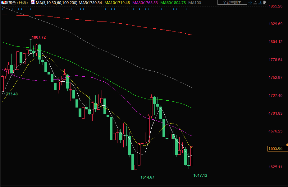 上周迄今金价上涨了约0.6%。盘中稍早,金价一度触及9月底以来的最低水平。美元指数逆转了稍早的升势,下跌0.6%。其他贵金属方面,现货白银上涨2.7%,至每盎司19.16美元;铂金上涨1.9%,至931美元;钯金下跌1.8%,至2020.34美元。