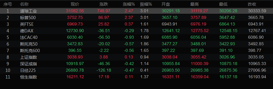 美股收盘情况:道琼斯工业指数上涨2.47%,至31082.56点;标普500指数上涨2.37%,至3752.75点;纳斯达克指数上涨2.31%,至10859.72点。