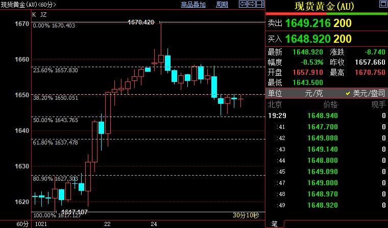 北京时间20:11,现货黄金下跌0.40%至1649.35美元/盎司;COMEX期金主力合约下跌0.14%至1653.7美元/盎司;美元指数上浮0.22%至112.120。