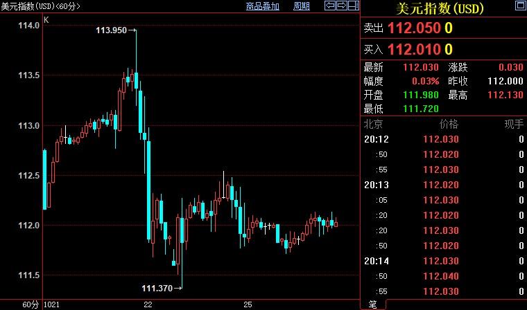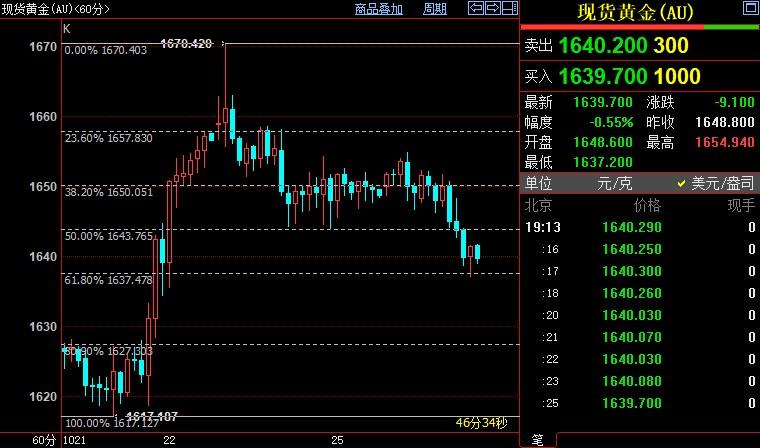 北京时间20:14,现货黄金下跌0.33%至1644.06美元/盎司;COMEX期金主力合约下跌0.36%至1648.2美元/盎司;美元指数上浮0.05%至112.039。
