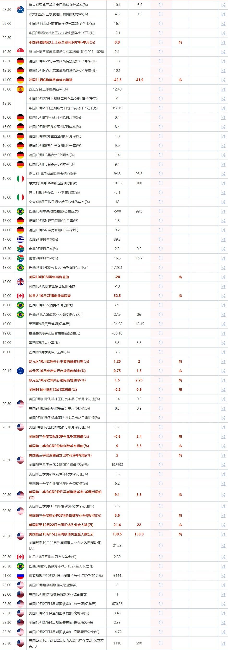 2022年10月27日,全球主要经济体将公布经济数据,需重点关注德国11月Gfk消费者信心指数,英国10月CBI零售销售差值,美国第三季度实际GDP年化季率初值,美国第三季度核心PCE物价指数年化季率初值,美国截至10月22日当周初请失业金人数,美国9月耐用品订单月率初值。大事方面需关注:欧洲央行公布利率决议。