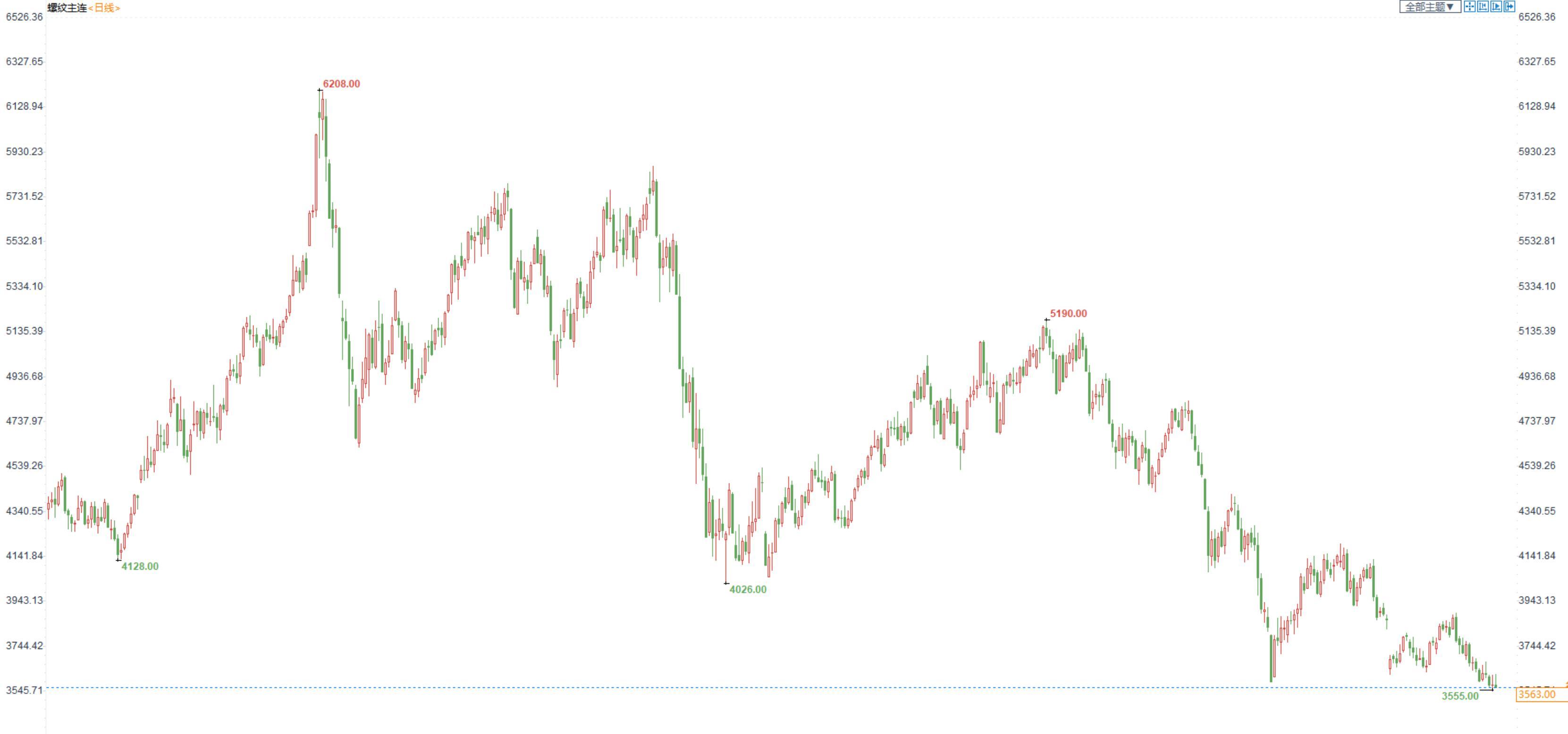 价格:螺纹钢2301合约今日在开盘后迅速上行,之后又再次下跌,整体呈现宽幅震荡,收盘价3563元/吨,小幅收跌0.72%。上海中天现货价为3840元/吨,环比减少20元/吨。