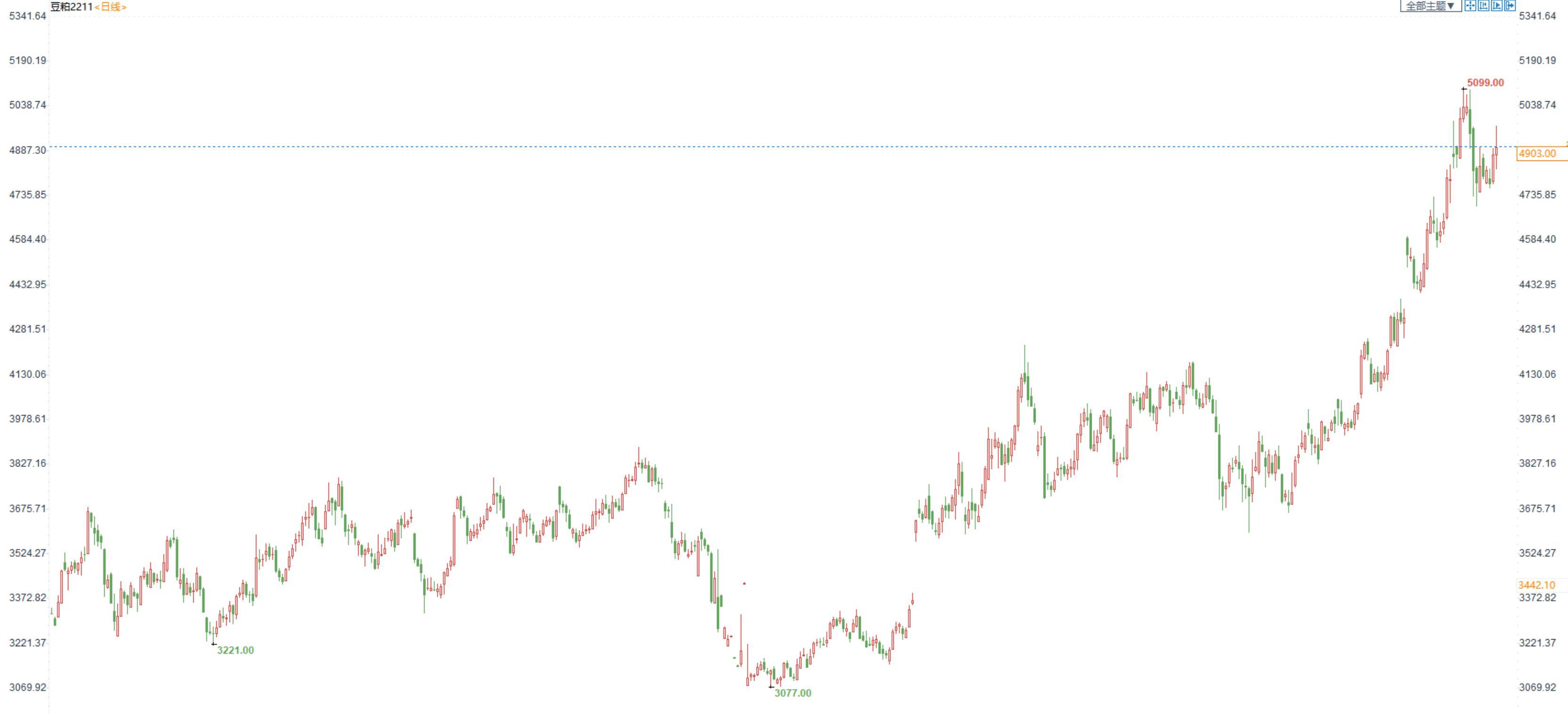 豆粕2301合约日内跌0.71%,收盘价4073元/吨,现货张家港43%蛋白豆粕5380元/吨。