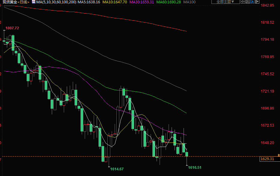 金价周四跌至逾一个月最低,在美联储主席鲍威尔做出鹰派发言后,美元和美国国债收益率跳升,打击了非孳息黄金的吸引力。现货金下跌0.3%,报每盎司1629.97美元,稍早一度下跌超过1%,触及9月28日以来最低。