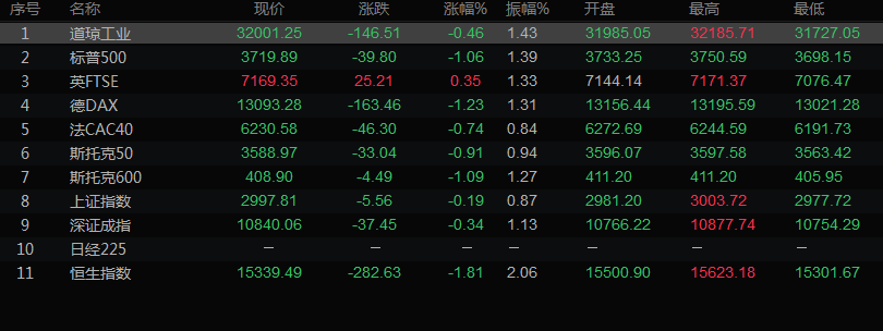 美股收盘情况:道琼斯工业指数下跌0.46%,至32001.25;标普500指数下跌1.06%,至3719.89;纳斯达克指数下跌1.73%,至10342.94。