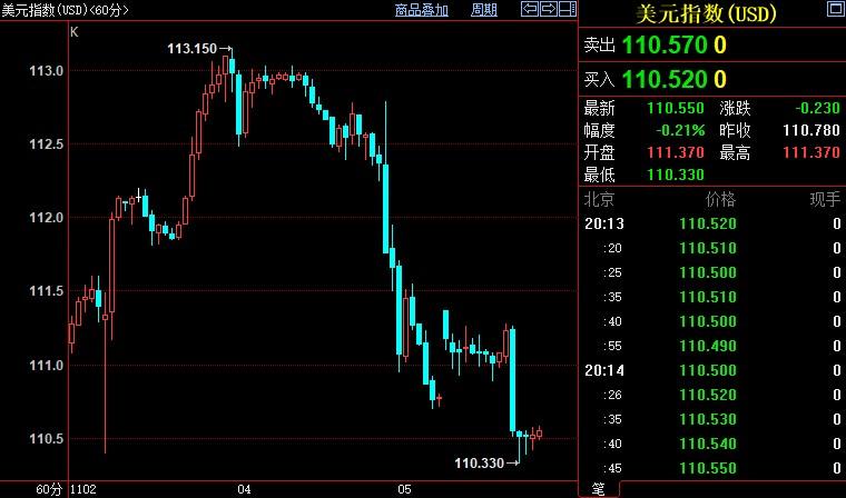 北京时间20:14,现货黄金下跌0.21%至1677.43美元/盎司;COMEX期金主力合约上涨0.23%至1680.4美元/盎司;美元指数下跌0.21%至110.55。金价盘中一度跌近0.9%,美指一度上涨0.5%。