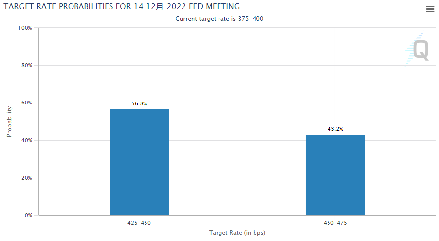 CME“联储观察”公布最新数据显示,市场预计美联储在12月会议上至少加息50个基点,但连续第五次加息75个基点的可能性不到45%。一些美联储决策者上周五(11月4日)表示,他们继续考虑在下次政策会议上放慢加息步伐。