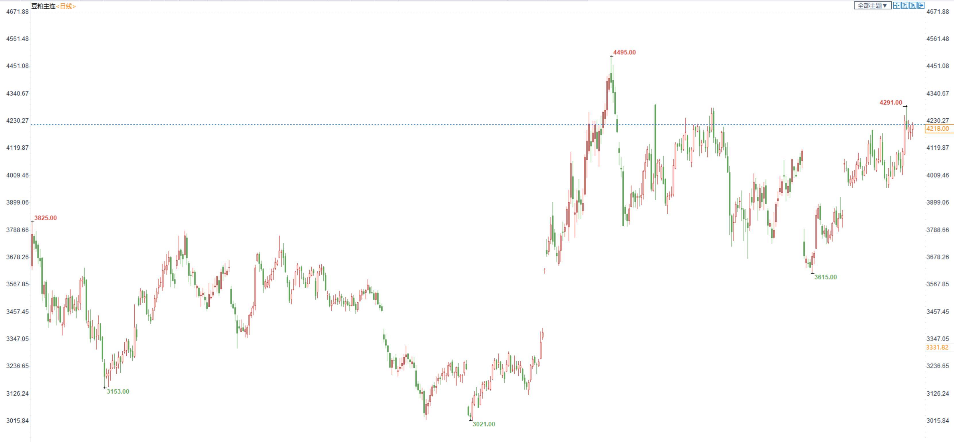豆粕2301合约日内涨0.72%,收盘价4218元/吨,现货张家港43%蛋白豆粕5630元/吨。