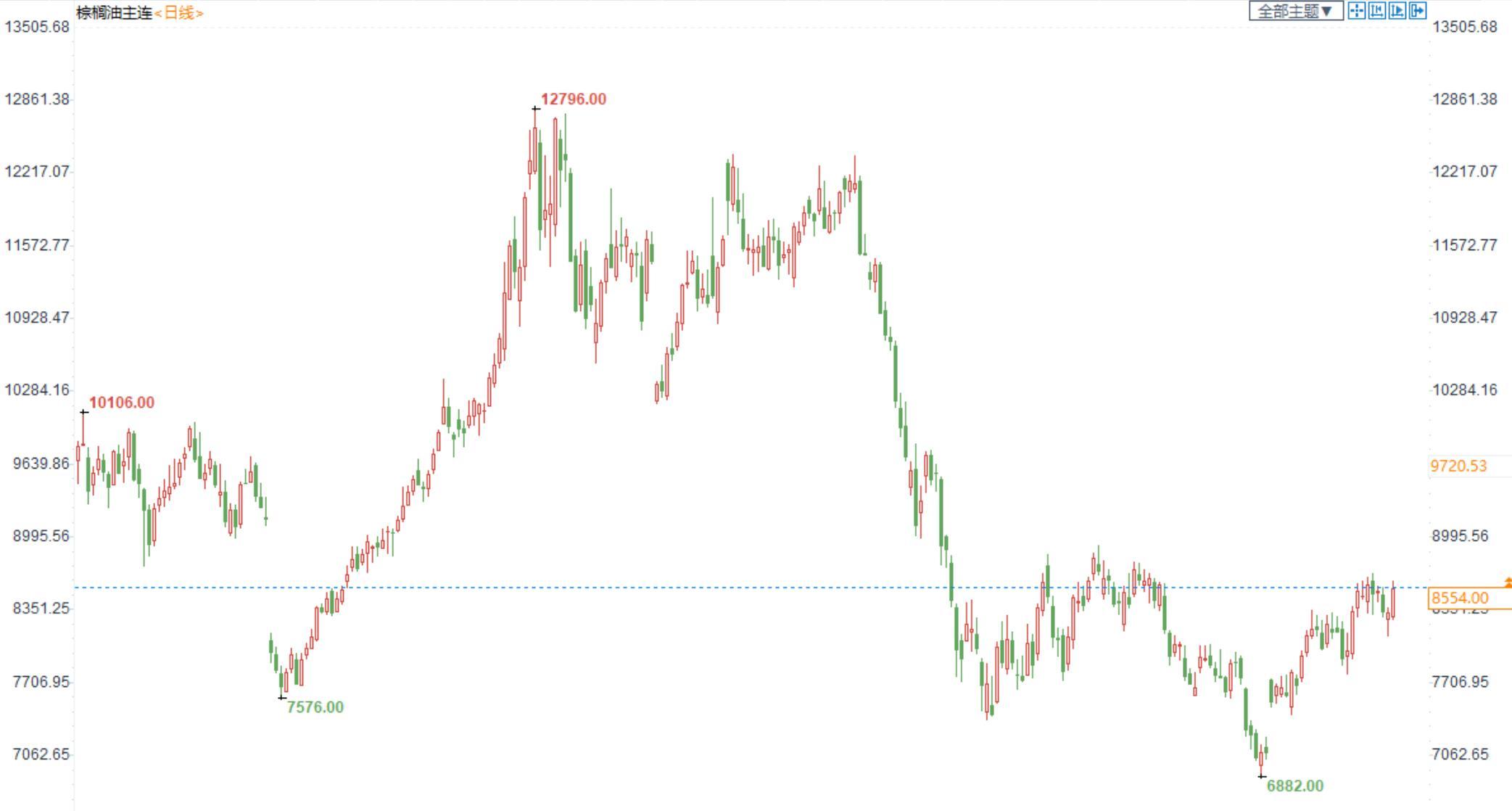 棕榈油2301合约日内跌1.81%,收盘8346元/吨;广州市场棕榈油8510元/吨。