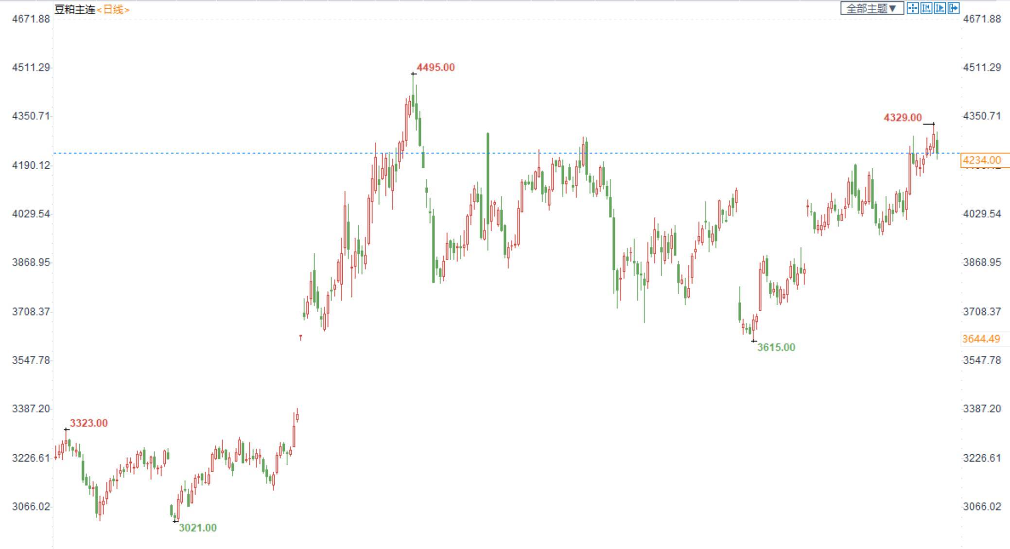 豆粕2301合约日内涨0.33%,收盘价4260元/吨,现货张家港43%蛋白豆粕5675元/吨。
