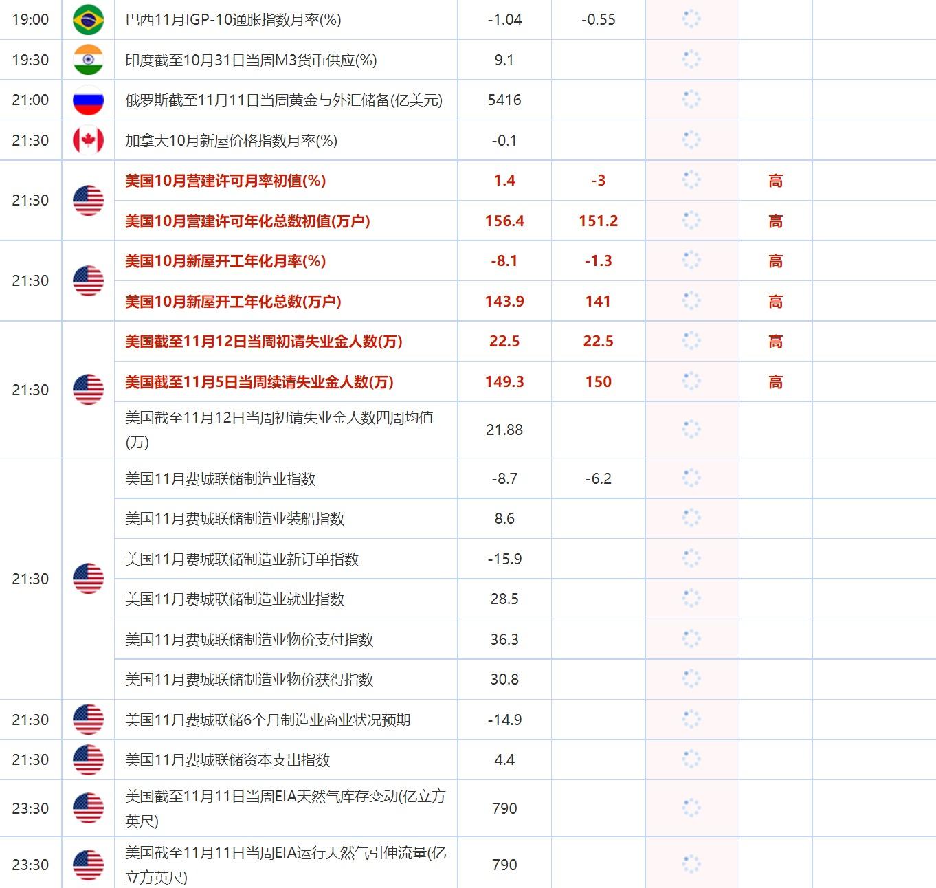21:30 美国10月营建许可月率初值(%) , 前值 1.4 , 预期值 -3 , 公布值:待发布