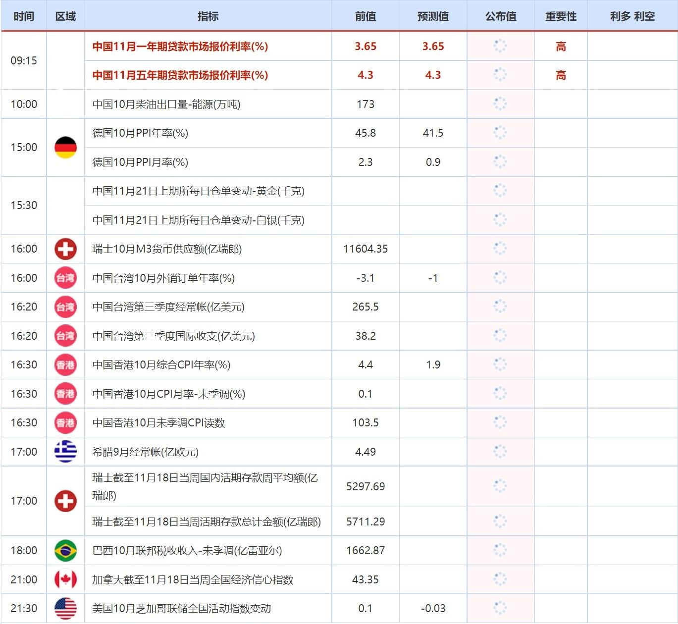 11月21日(周一),投资者需关注的重点数据:中国11月一年期贷款市场报价利率 ,中国11月五年期贷款市场报价利率 ,中国10月柴油出口量-能源 ,德国10月PPI年率 ,加拿大截至11月18日当周全国经济信心指数和美国10月芝加哥联储全国活动指数变动。需关注的大事件:英国央行副行长坎利夫就政策制定者面临的挑战和机遇发表讲话,欧洲央行管委霍尔茨曼发表讲话。