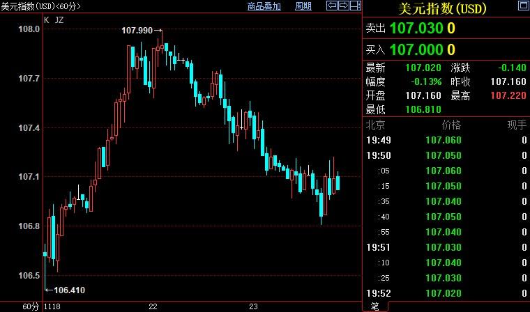 北京时间19:51,现货黄金下跌0.05%至1739.10美元/盎司;COMEX期金主力合约下跌0.01%至1739.8美元/盎司;美元指数下跌0.12%至107.033。