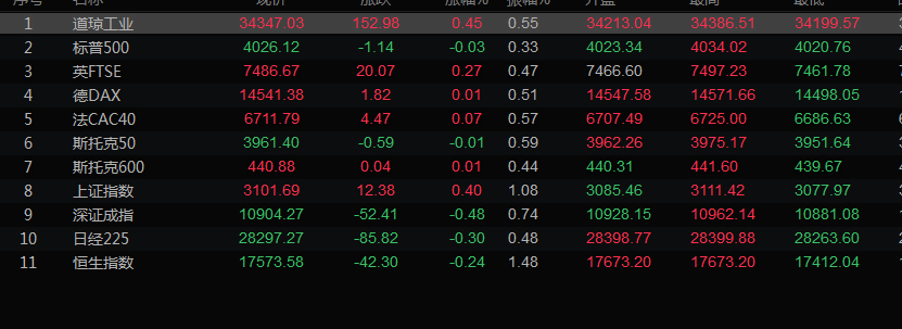 美股收盘情况:道琼斯工业指数上涨0.45%,至34347.03点;标普500指数下跌0.03%,至4026.12点;纳斯达克指数下跌0.52%,至11226.36点。