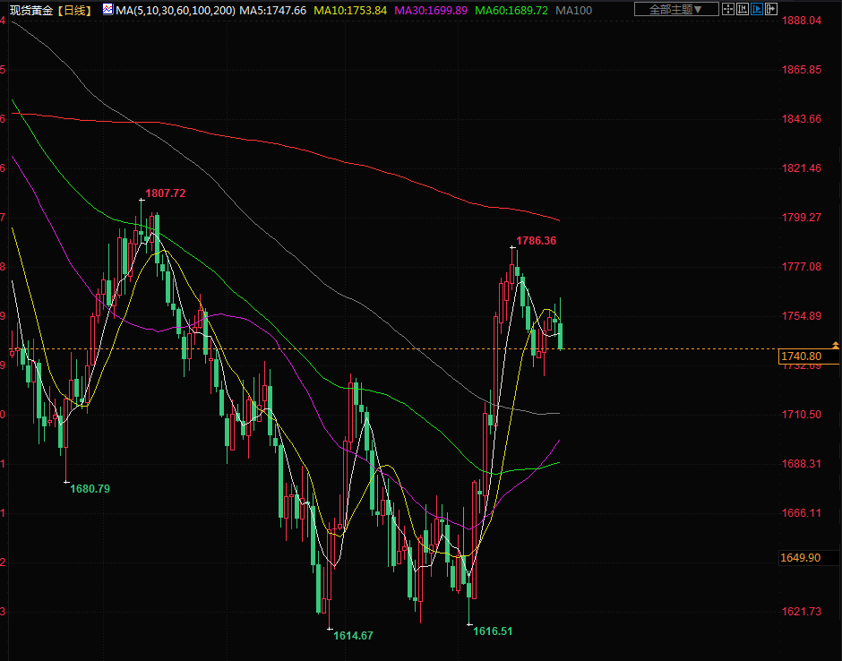 金价周一从逾一周高位回落,美元从盘中低位回升,美联储官员做出鹰派发言,重申对抗通胀的承诺。现货金下跌0.8%,报每盎司1741.35美元,盘中稍早触及11月18日以来最高。